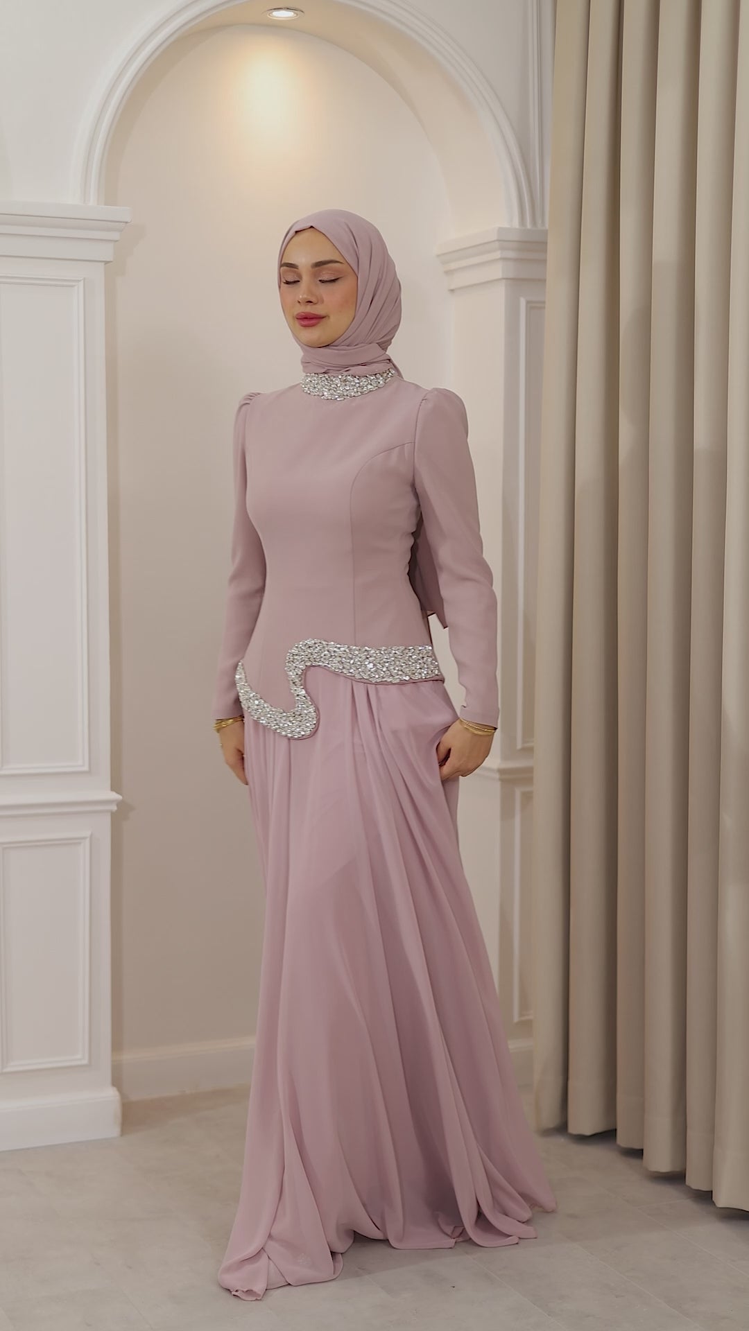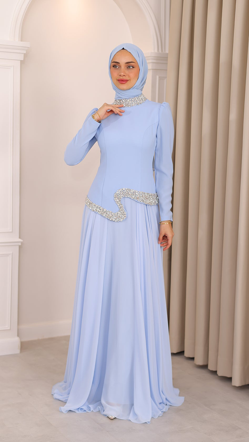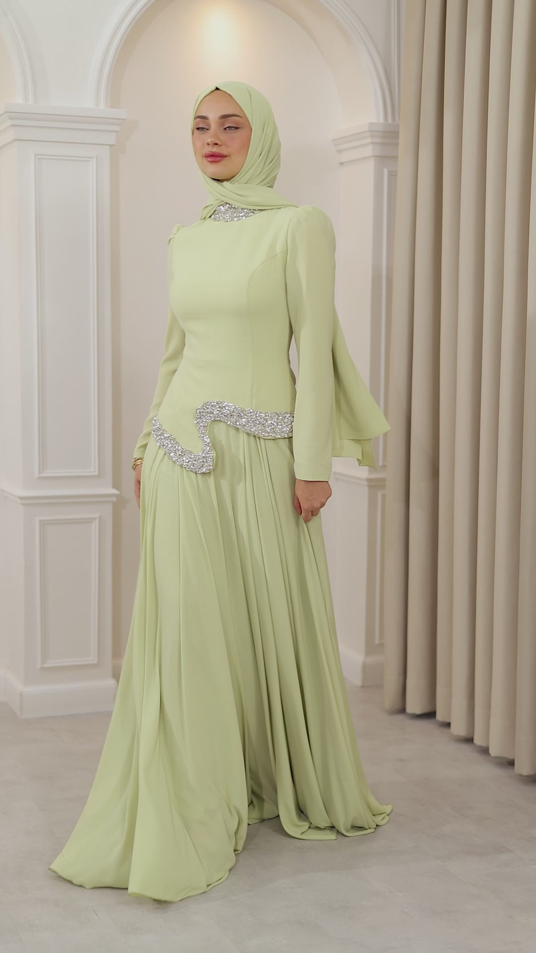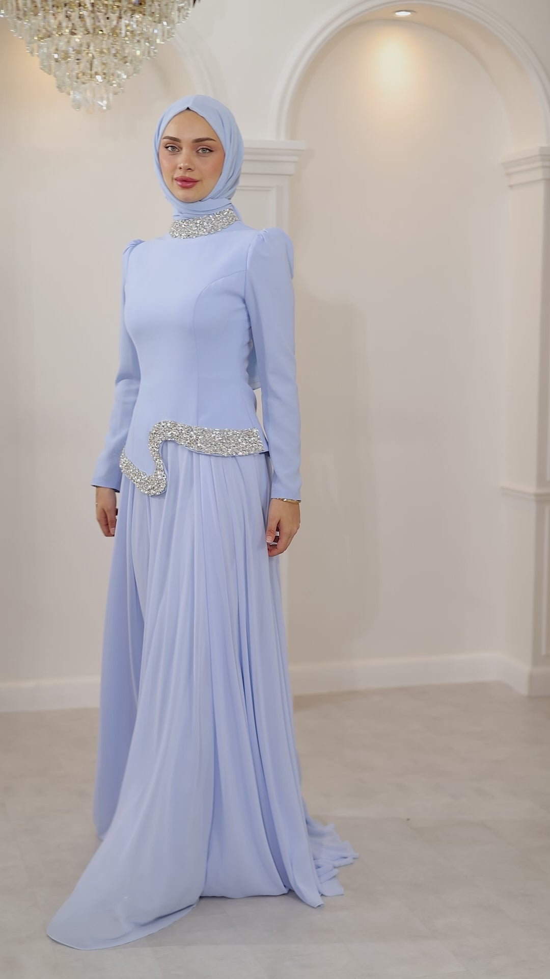 Zarafetin modern yorumunu taşıyan bu abiye, akıcı duruşu ve ince detaylarıyla büyüleyici bir siluet oluşturur. Beden kısmında kullanılan krep kumaş, formu mükemmel şekilde sararken, ultra kilo şifon eteği her adımda zarif bir hareket kazandırır. Özel günlerde hafifliğiyle konfor sunarken, göz alıcı duruşuyla unutulmaz bir şıklık sağlar.