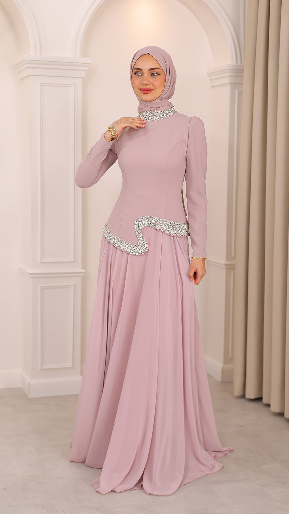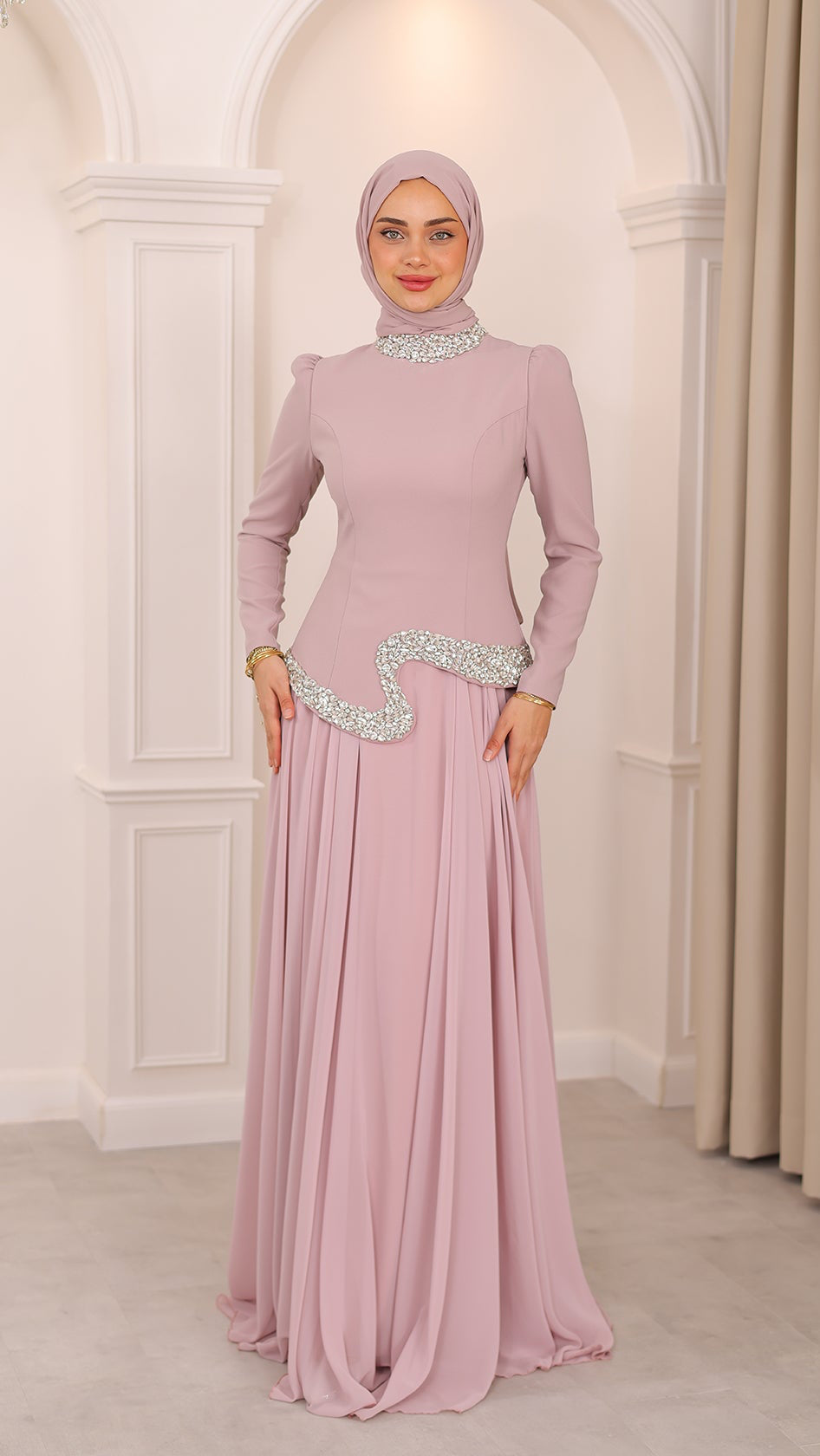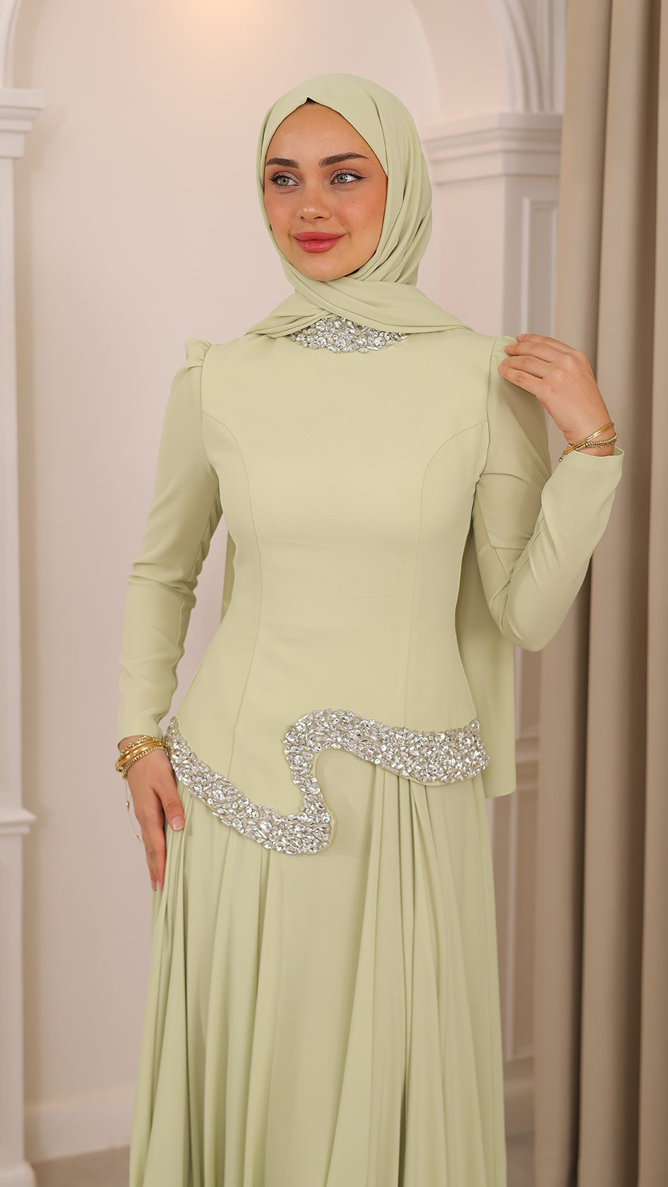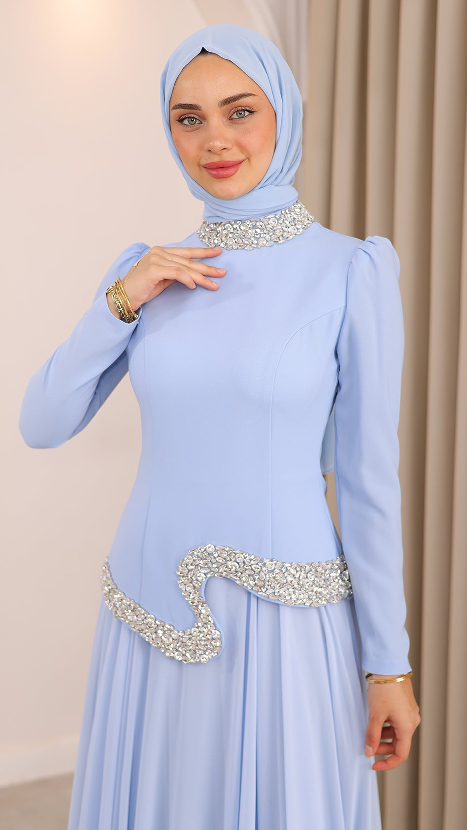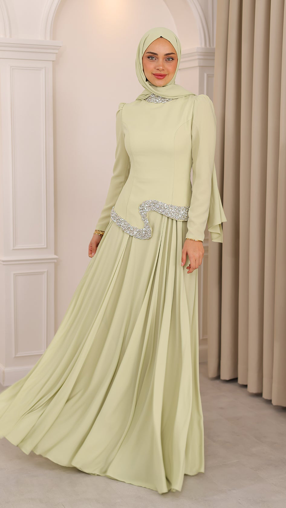 Zarafetin modern yorumunu taşıyan bu abiye, akıcı duruşu ve ince detaylarıyla büyüleyici bir siluet oluşturur. Beden kısmında kullanılan krep kumaş, formu mükemmel şekilde sararken, ultra kilo şifon eteği her adımda zarif bir hareket kazandırır. Özel günlerde hafifliğiyle konfor sunarken, göz alıcı duruşuyla unutulmaz bir şıklık sağlar.