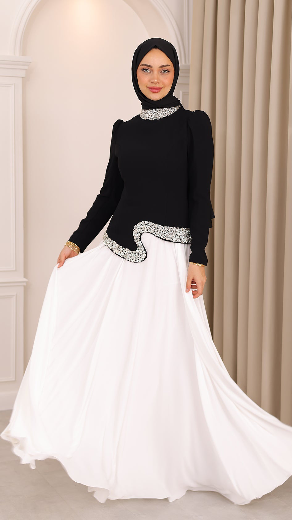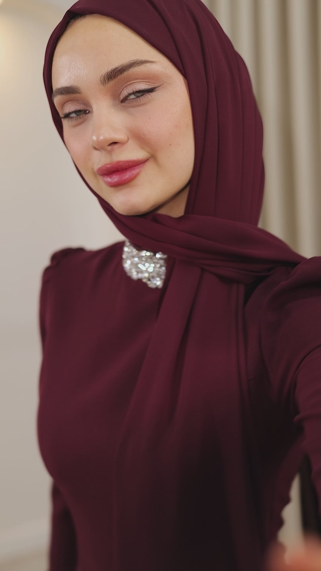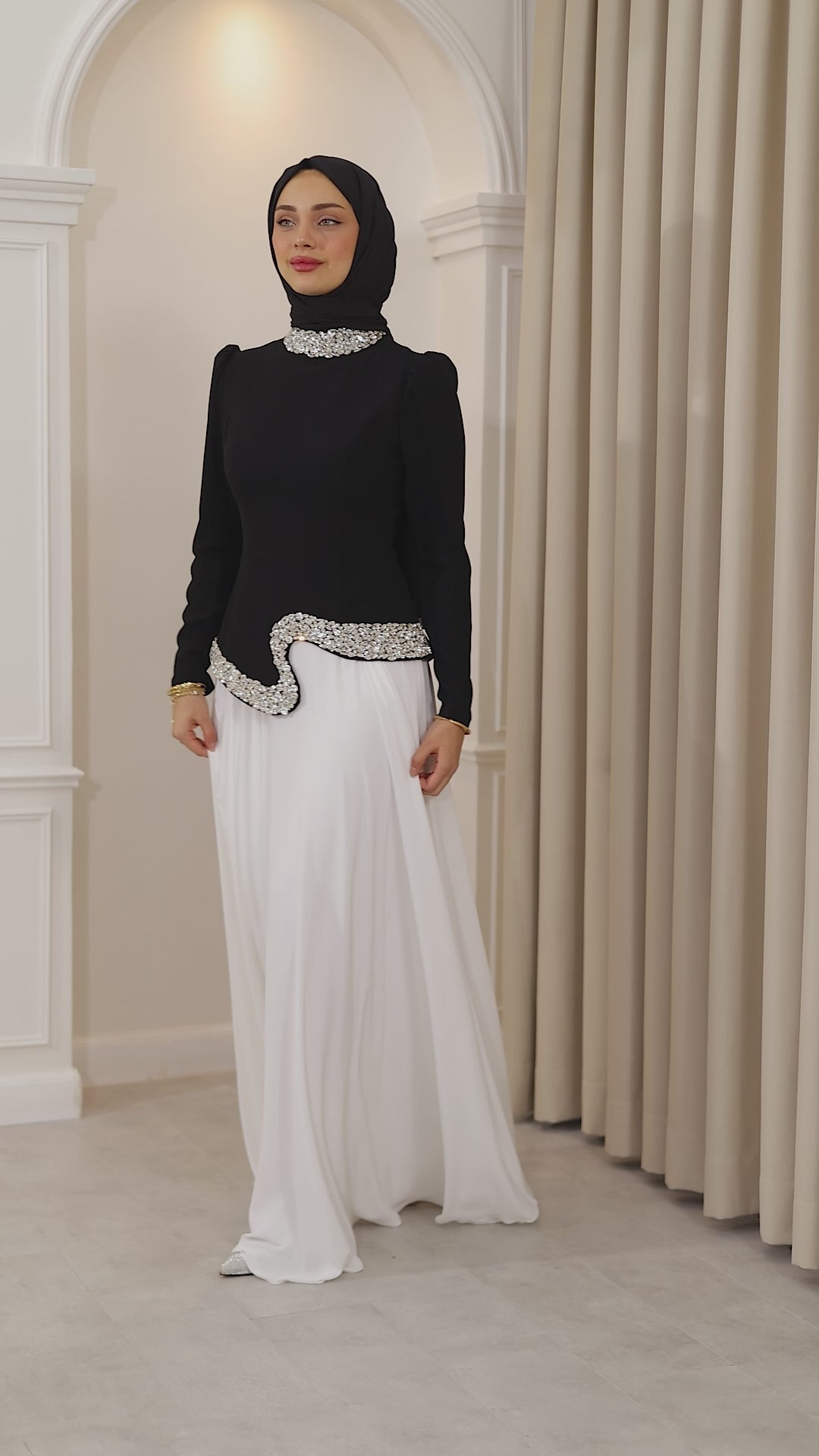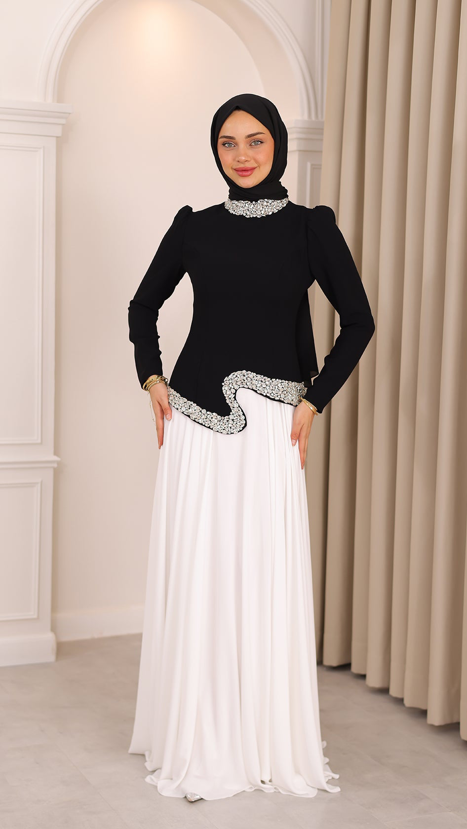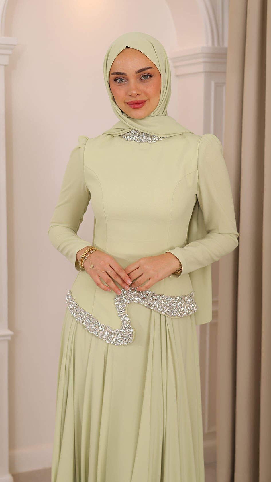 Zarafetin modern yorumunu taşıyan bu abiye, akıcı duruşu ve ince detaylarıyla büyüleyici bir siluet oluşturur. Beden kısmında kullanılan krep kumaş, formu mükemmel şekilde sararken, ultra kilo şifon eteği her adımda zarif bir hareket kazandırır. Özel günlerde hafifliğiyle konfor sunarken, göz alıcı duruşuyla unutulmaz bir şıklık sağlar.