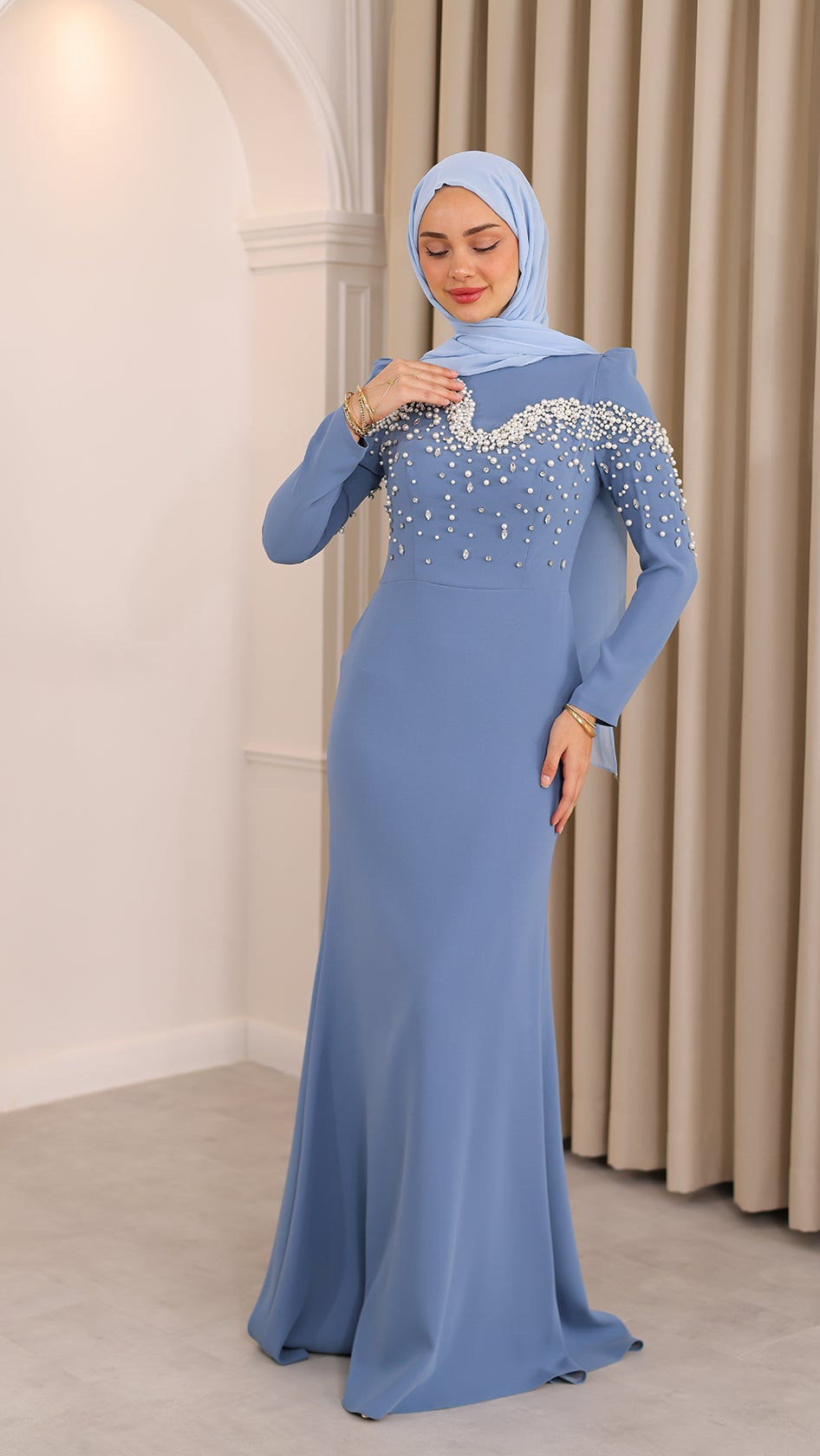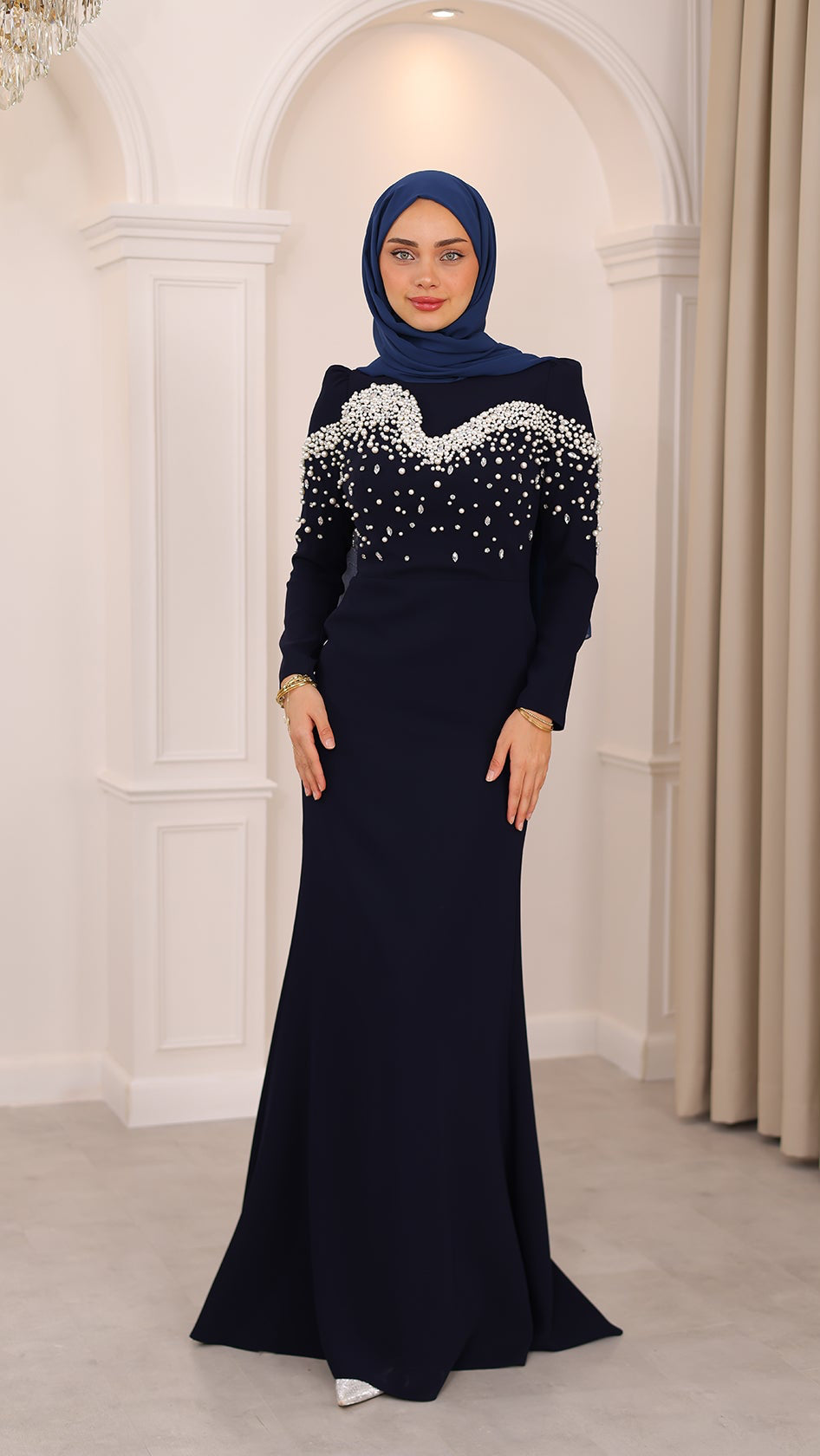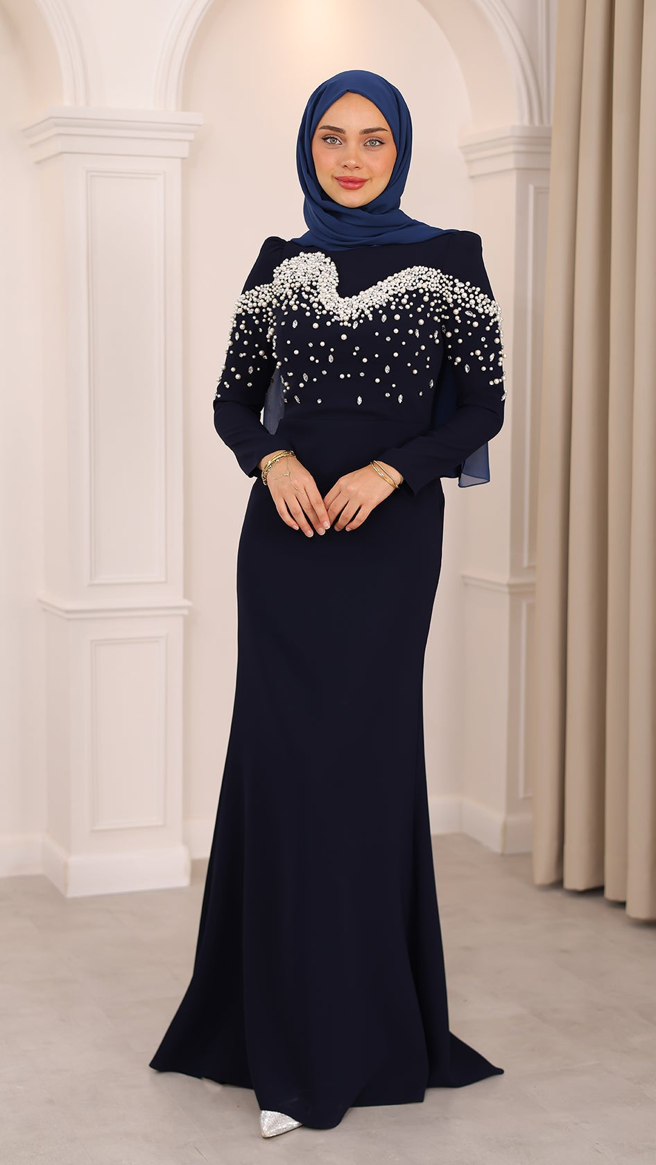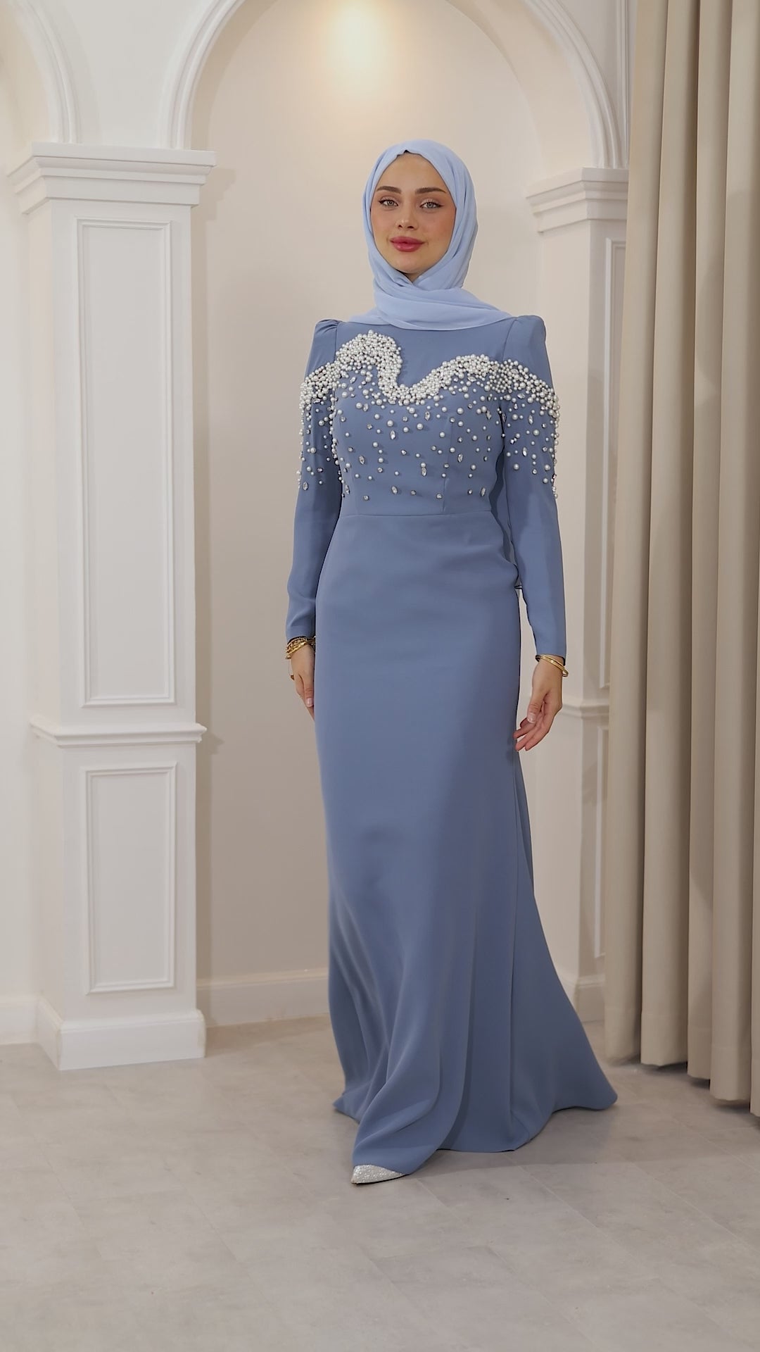 İnci detaylarıyla her hareketinde ışıldayan bu balık kesim abiye, silueti ustalıkla vurgulayan formuyla asaletin en modern yorumunu sunuyor. Kumaşın akışı, ışıltılı dokunuşlarla buluşarak büyüleyici bir uyum yaratıyor. Her adımı sahneye dönüştüren bu özel tasarım, zarafetini sade bir ışıltıyla anlatmak isteyenlerin bir numaralı tercihi.