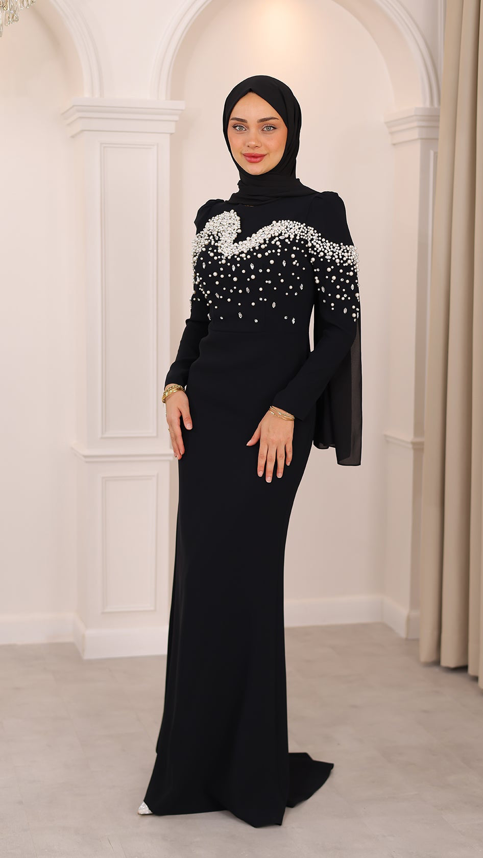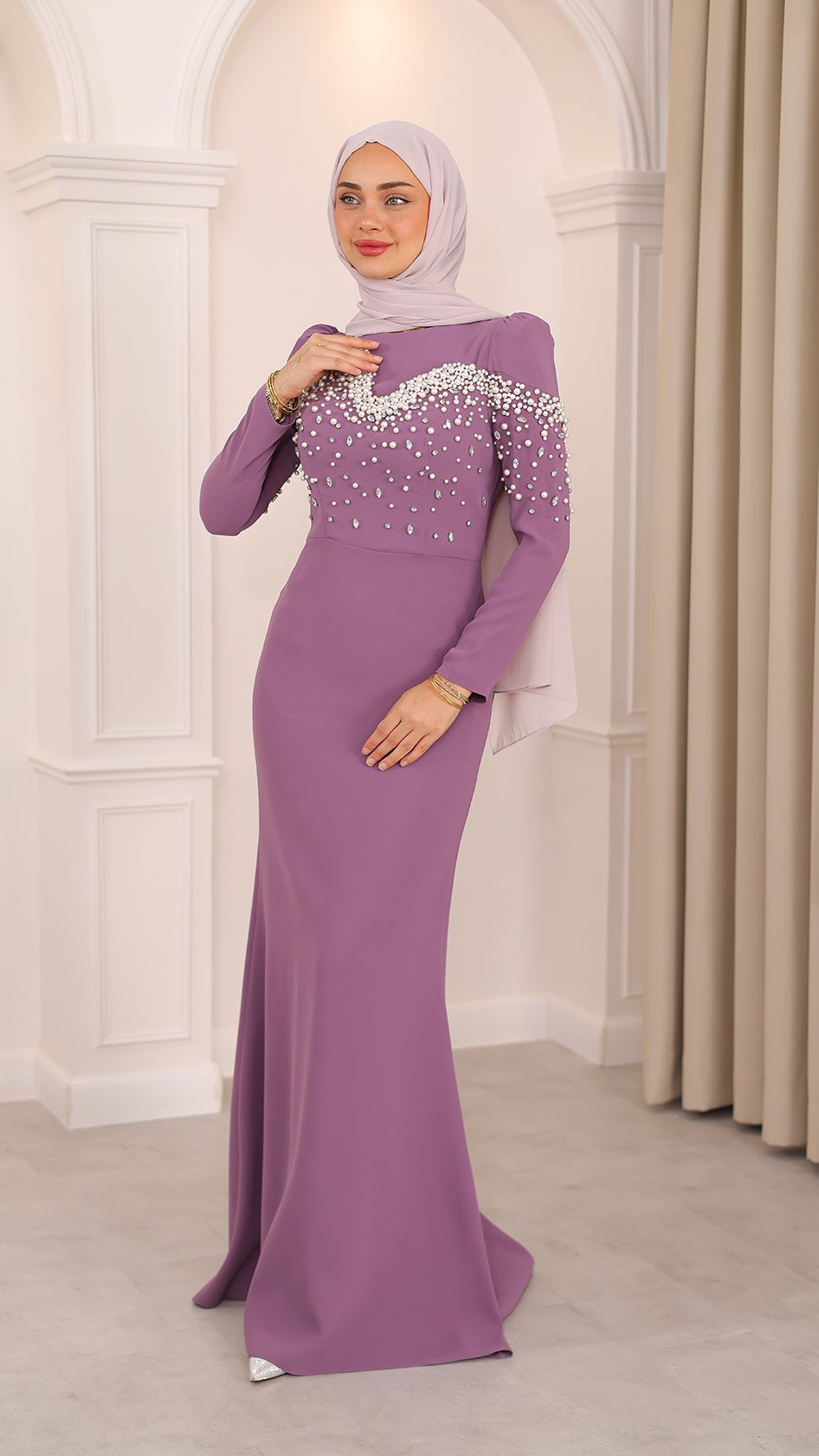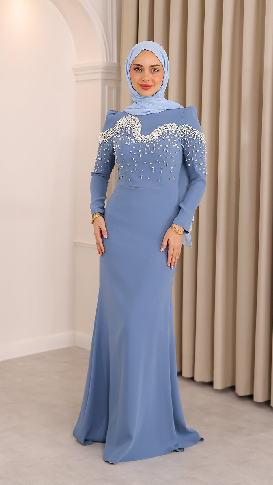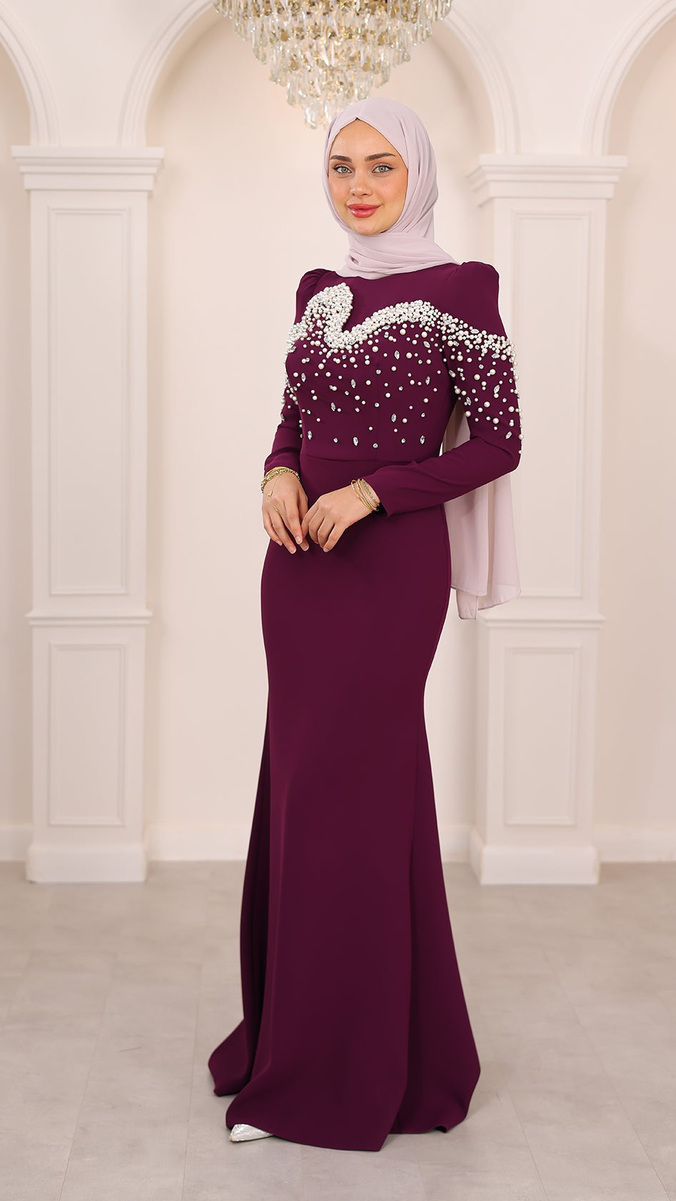 İnci detaylarıyla her hareketinde ışıldayan bu balık kesim abiye, silueti ustalıkla vurgulayan formuyla asaletin en modern yorumunu sunuyor. Kumaşın akışı, ışıltılı dokunuşlarla buluşarak büyüleyici bir uyum yaratıyor. Her adımı sahneye dönüştüren bu özel tasarım, zarafetini sade bir ışıltıyla anlatmak isteyenlerin bir numaralı tercihi.