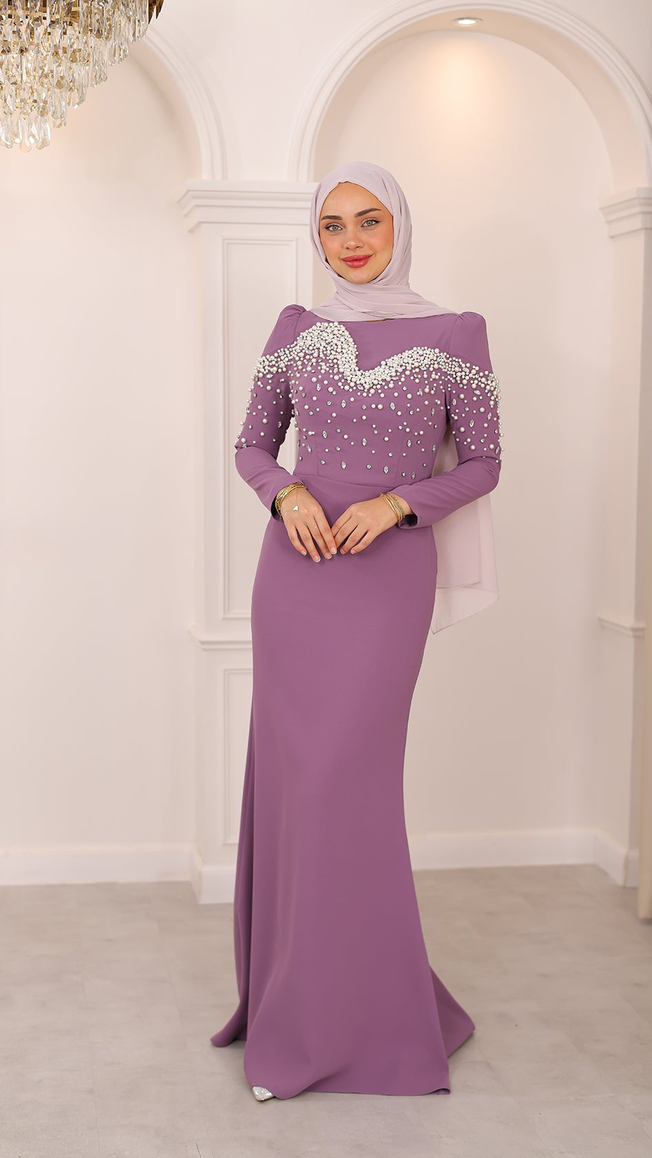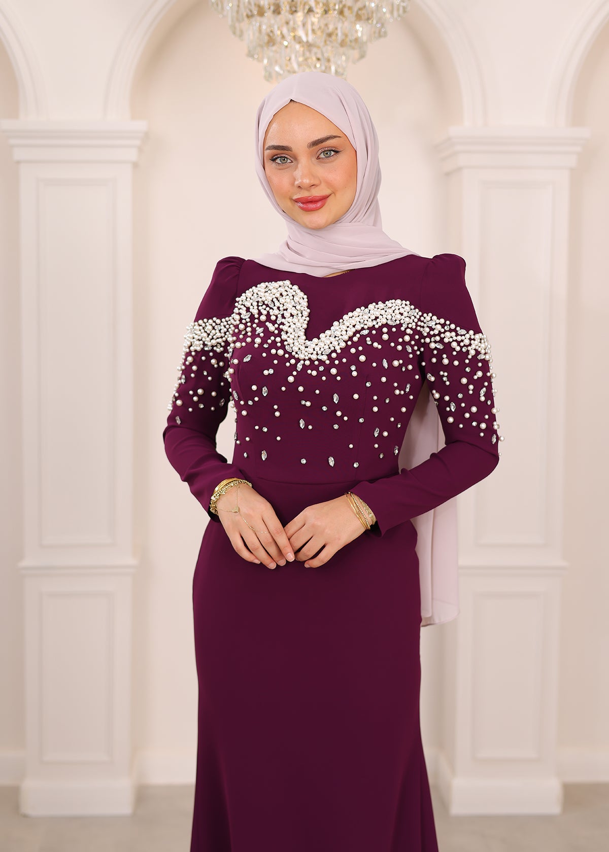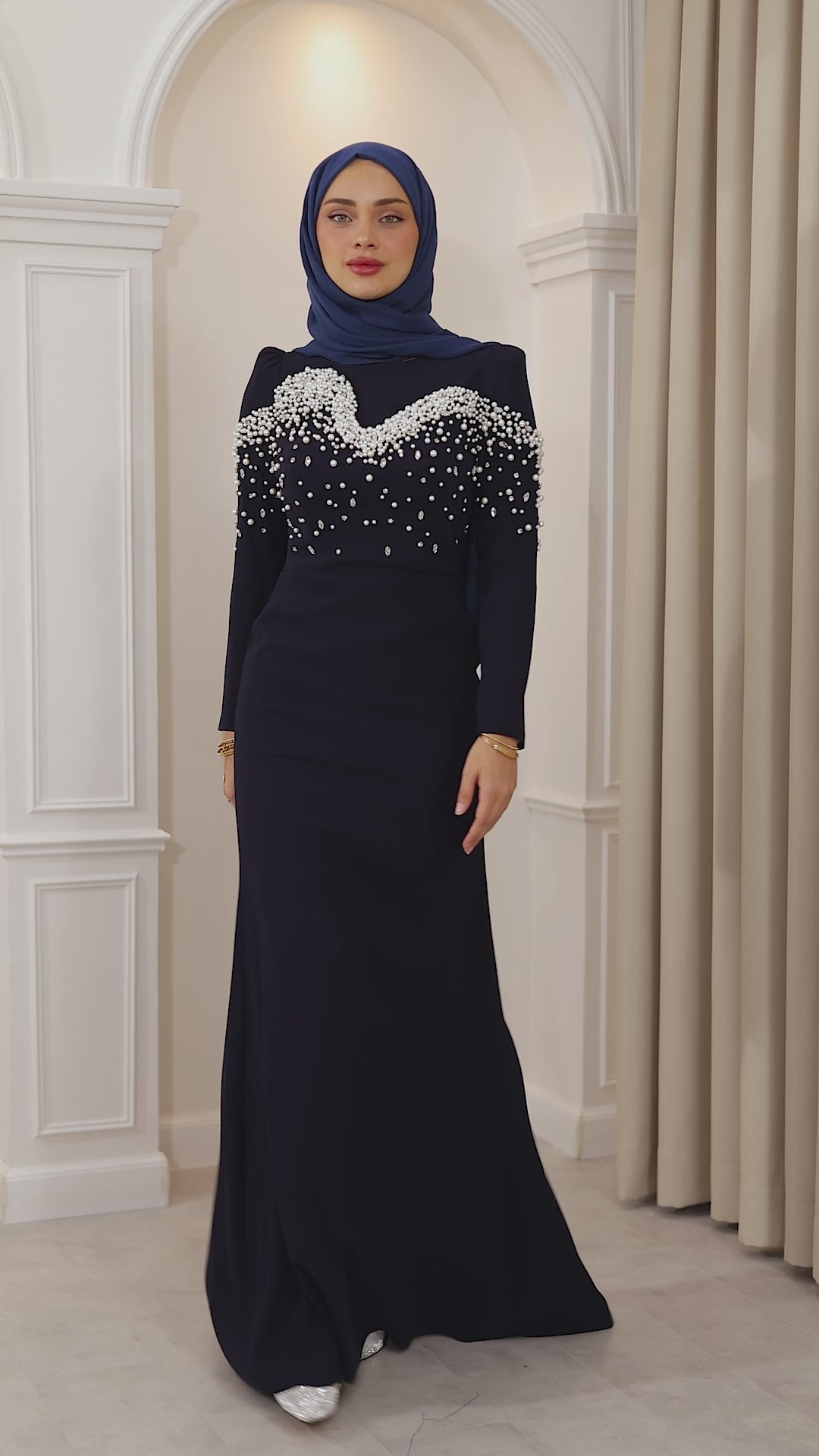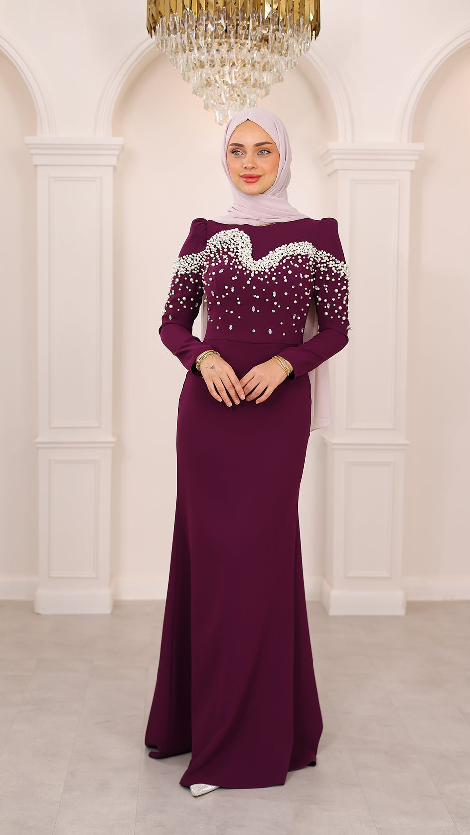İnci detaylarıyla her hareketinde ışıldayan bu balık kesim abiye, silueti ustalıkla vurgulayan formuyla asaletin en modern yorumunu sunuyor. Kumaşın akışı, ışıltılı dokunuşlarla buluşarak büyüleyici bir uyum yaratıyor. Her adımı sahneye dönüştüren bu özel tasarım, zarafetini sade bir ışıltıyla anlatmak isteyenlerin bir numaralı tercihi.