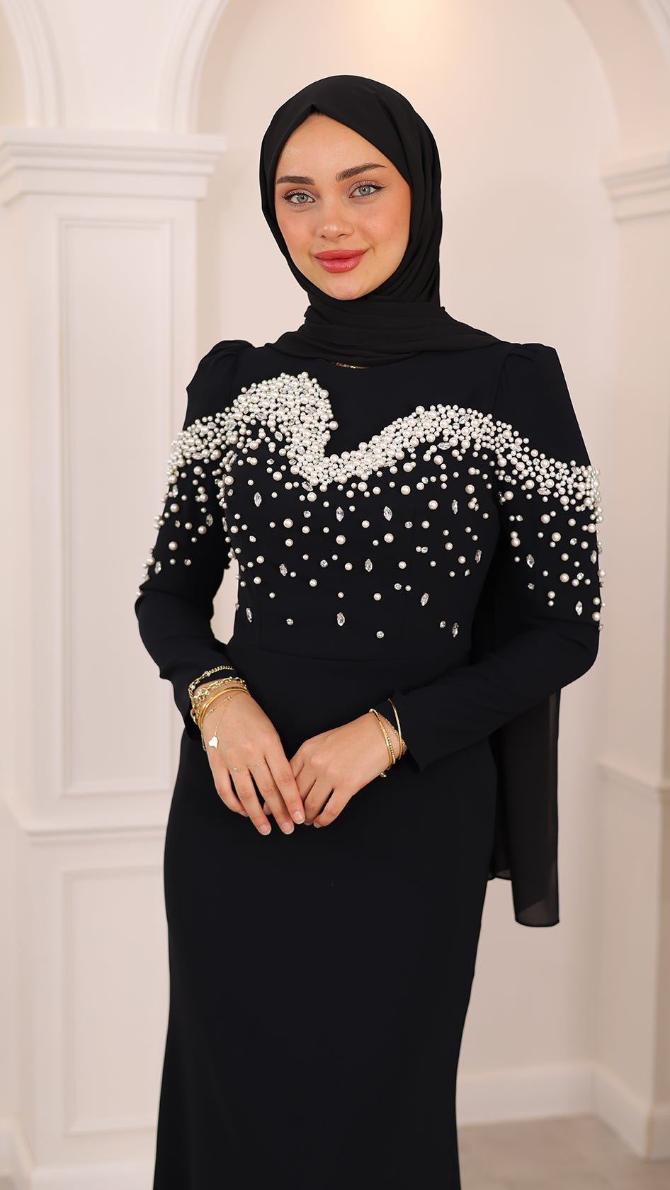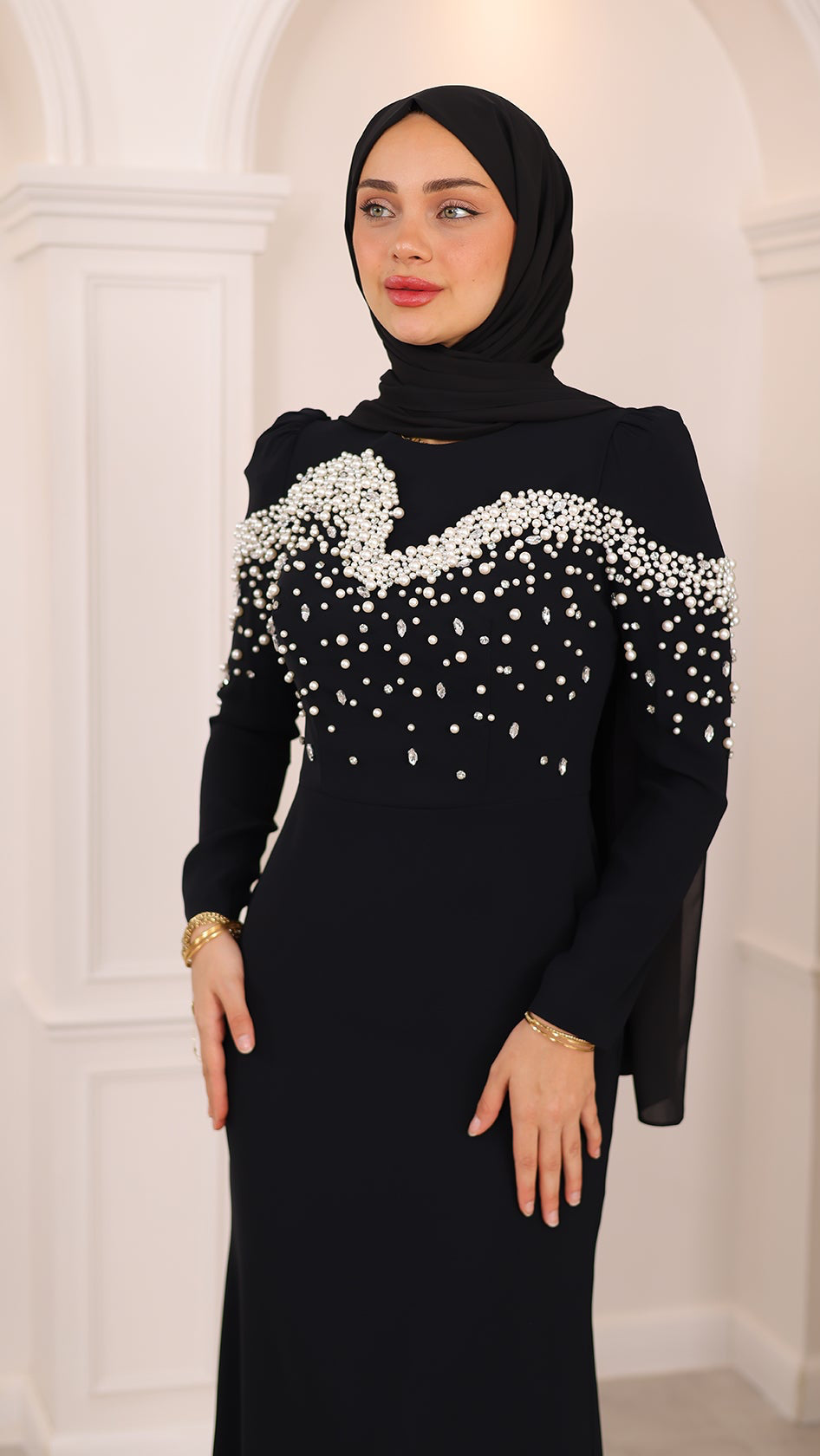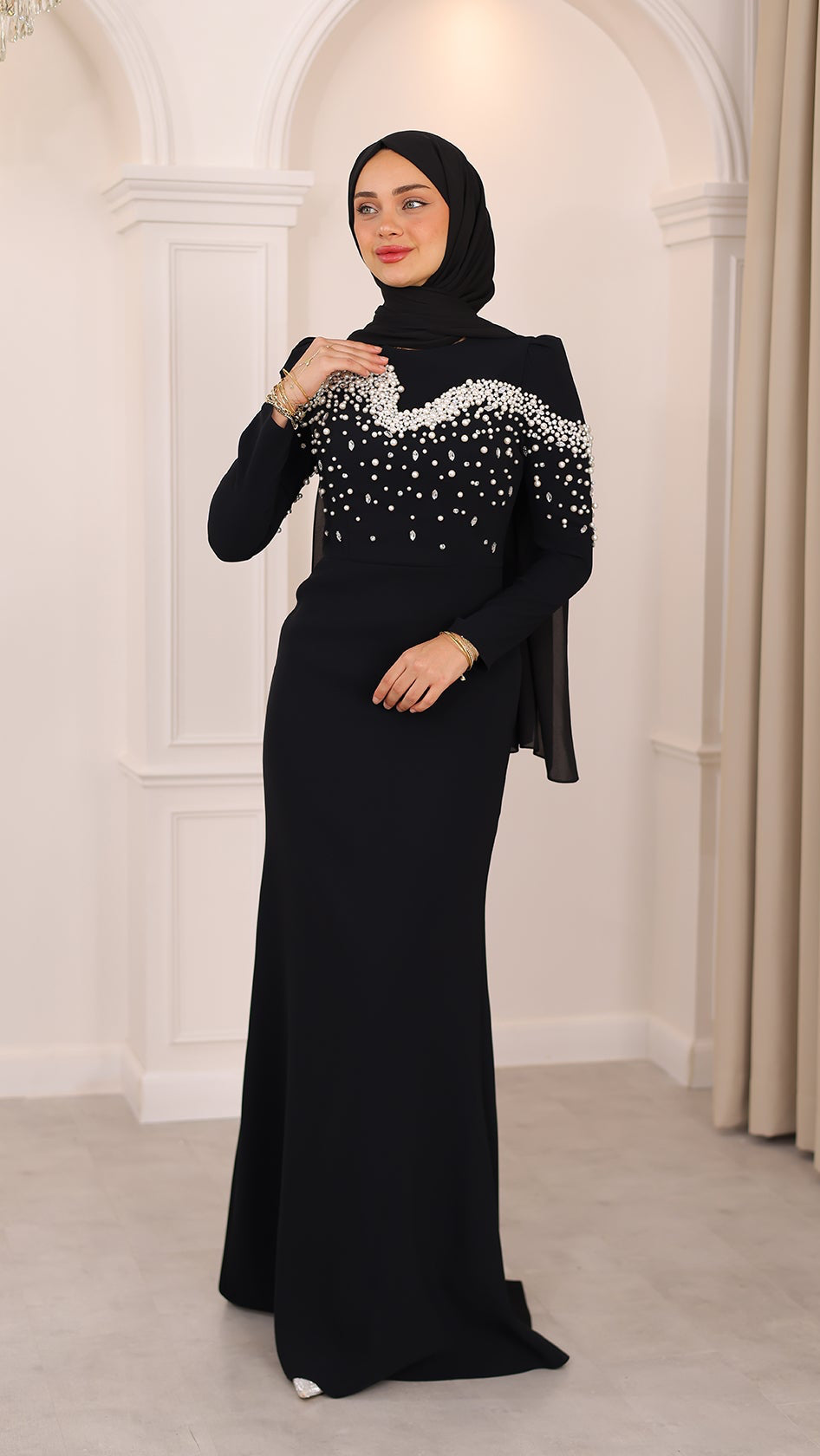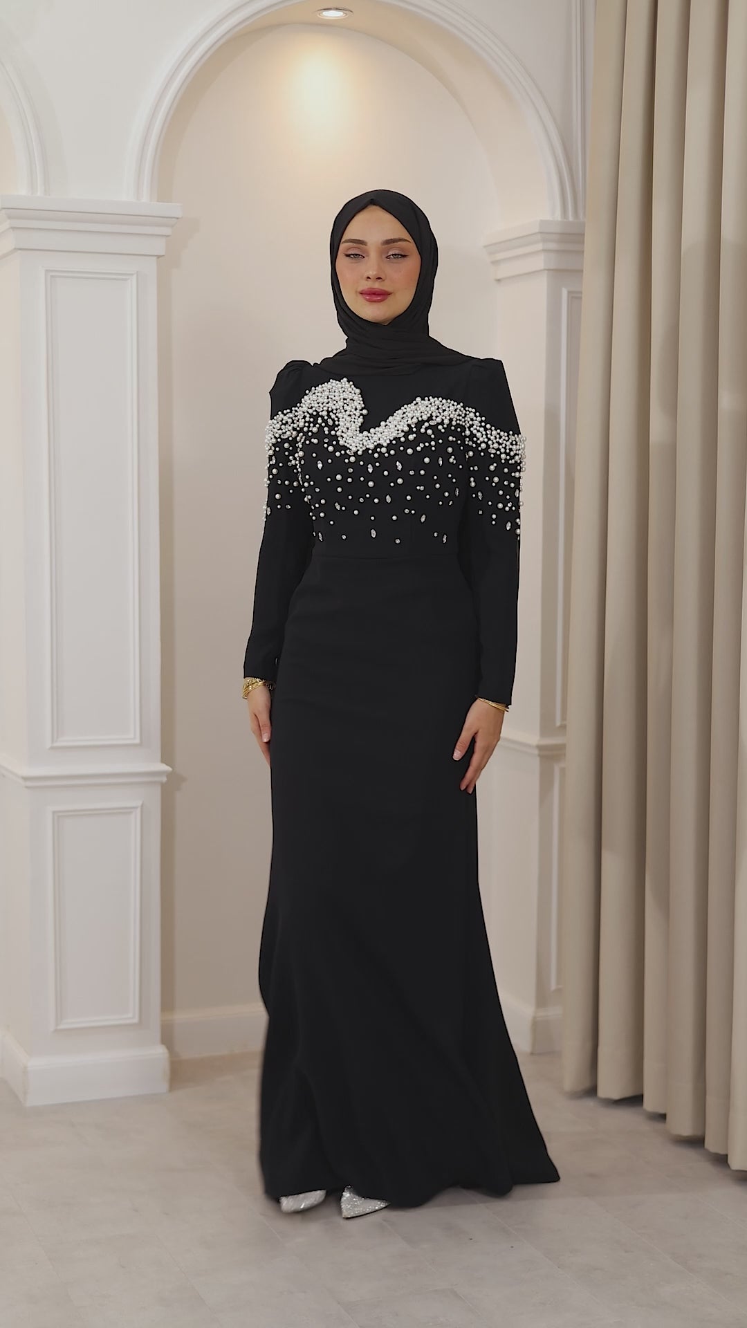 İnci detaylarıyla her hareketinde ışıldayan bu balık kesim abiye, silueti ustalıkla vurgulayan formuyla asaletin en modern yorumunu sunuyor. Kumaşın akışı, ışıltılı dokunuşlarla buluşarak büyüleyici bir uyum yaratıyor. Her adımı sahneye dönüştüren bu özel tasarım, zarafetini sade bir ışıltıyla anlatmak isteyenlerin bir numaralı tercihi.